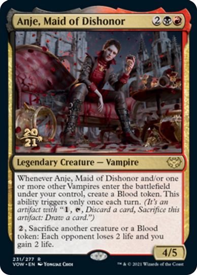 Description: Whenever Anje, Maid of Dishonor and/or one or more other Vampires enter the battlefield under your control, create a Blood token. This ability triggers only once each turn. (It's an artifact with "1, T, Discard a card, Sacrifice this artifact: Draw a card.")