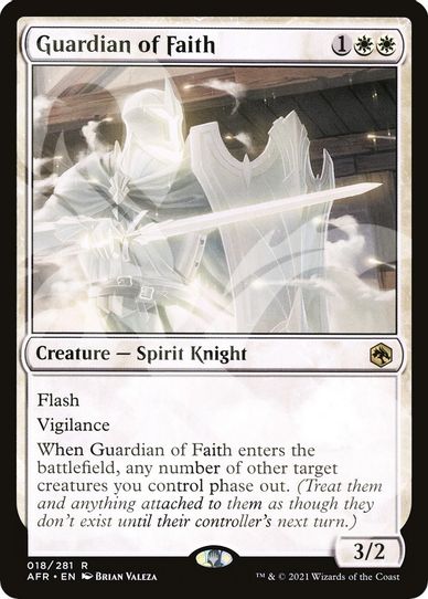 When Guardian of Faith enters the battlefield, any number of other target creatures you control phase out. (Treat them and anything attached to them as though they don't exist until their controller's next turn.)