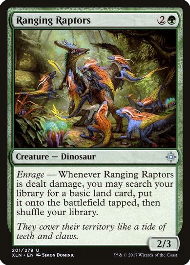 Description: Enrage — Whenever Ranging Raptors is dealt damage, you may search your library for a basic land card, put it onto the battlefield tapped, then shuffle your library.