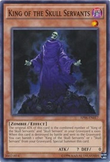 Description: The original ATK of this card is the combined number of "King of the Skull Servants" and "Skull Servant" in your Graveyard x 1000. When this card is destroyed by battle and sent to the Graveyard: You can banish 1 other "King of the Skull Servants" or "Skull Servant" from your Graveyard; Special Summon this card.