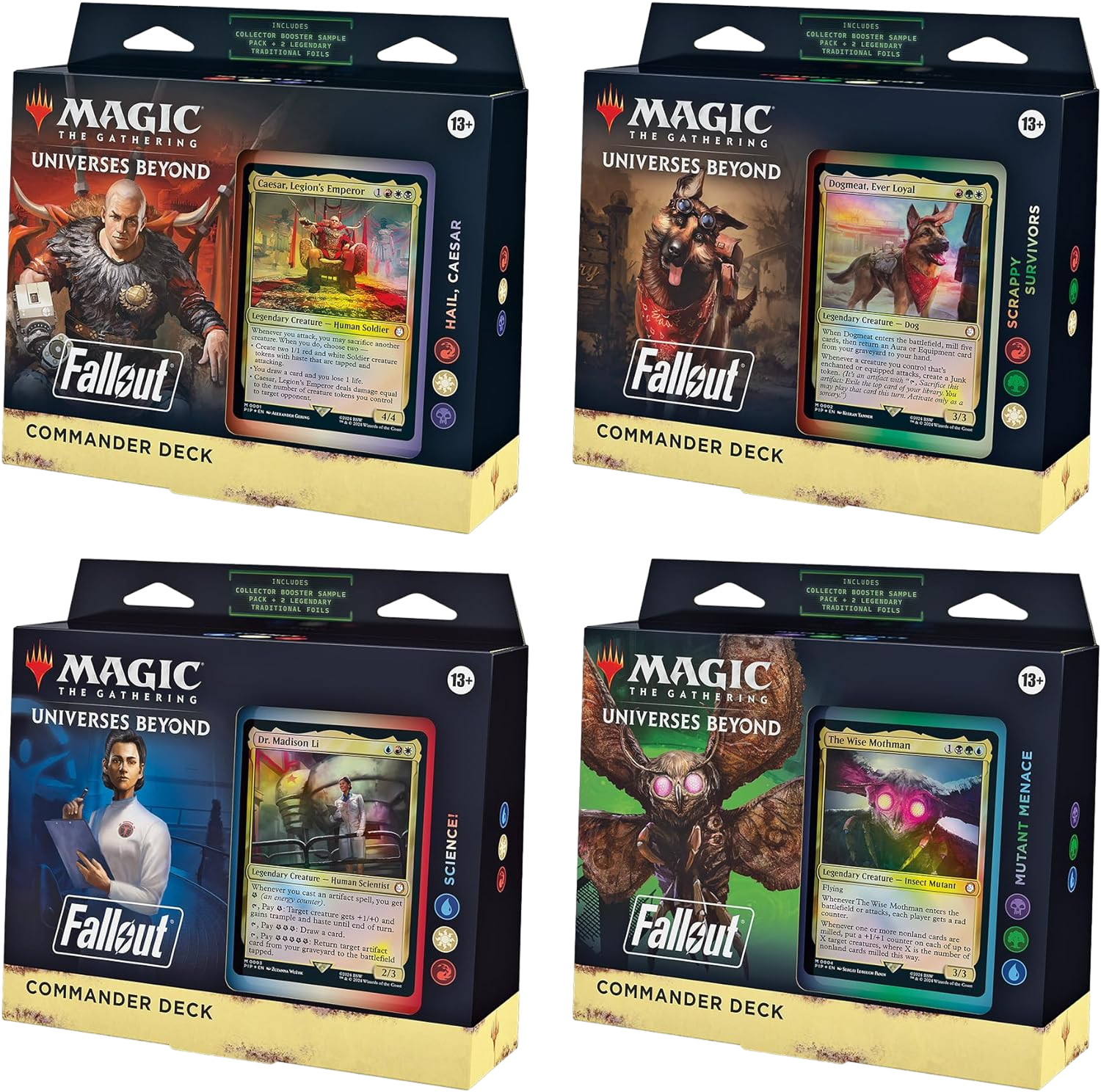 • GET ALL 4 FALLOUT COMMANDER DECKS—This bundle includes all 4 Magic: The Gathering Fallout Commander Decks, with 1 Hail Caesar deck, 1 Scrappy Survivors deck, 1 Science! deck, and 1 Mutant Menace deck
