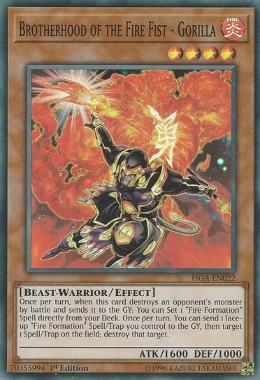 Description: Once per turn, when this card destroys an opponent's monster by battle and sends it to the Graveyard: You can Set 1 "Fire Formation" Spell Card directly from your Deck. Once per turn: You can send 1 face-up "Fire Formation" Spell/Trap Card you control to the Graveyard, then target 1 Spell/Trap Card on the field; destroy that target.