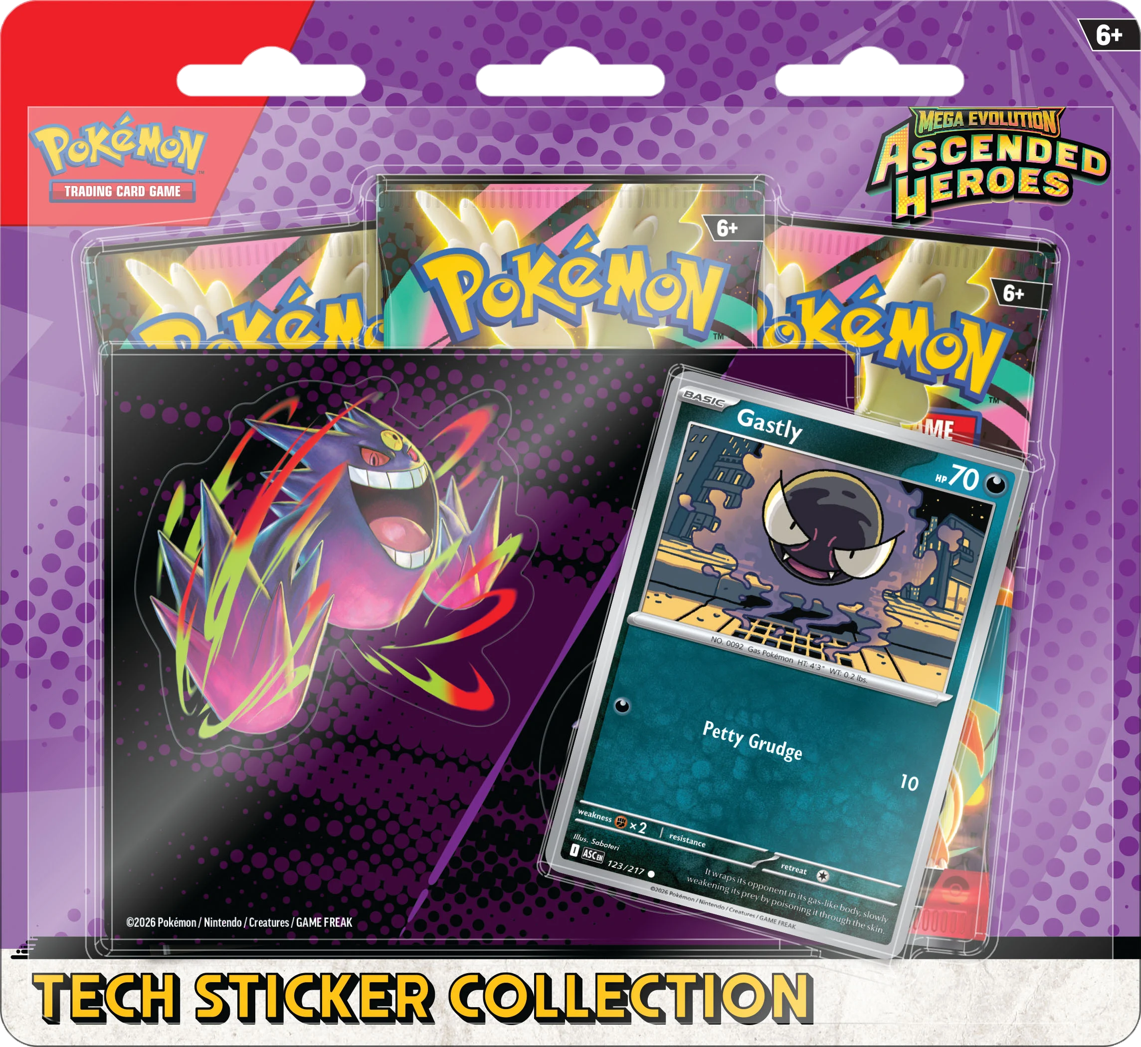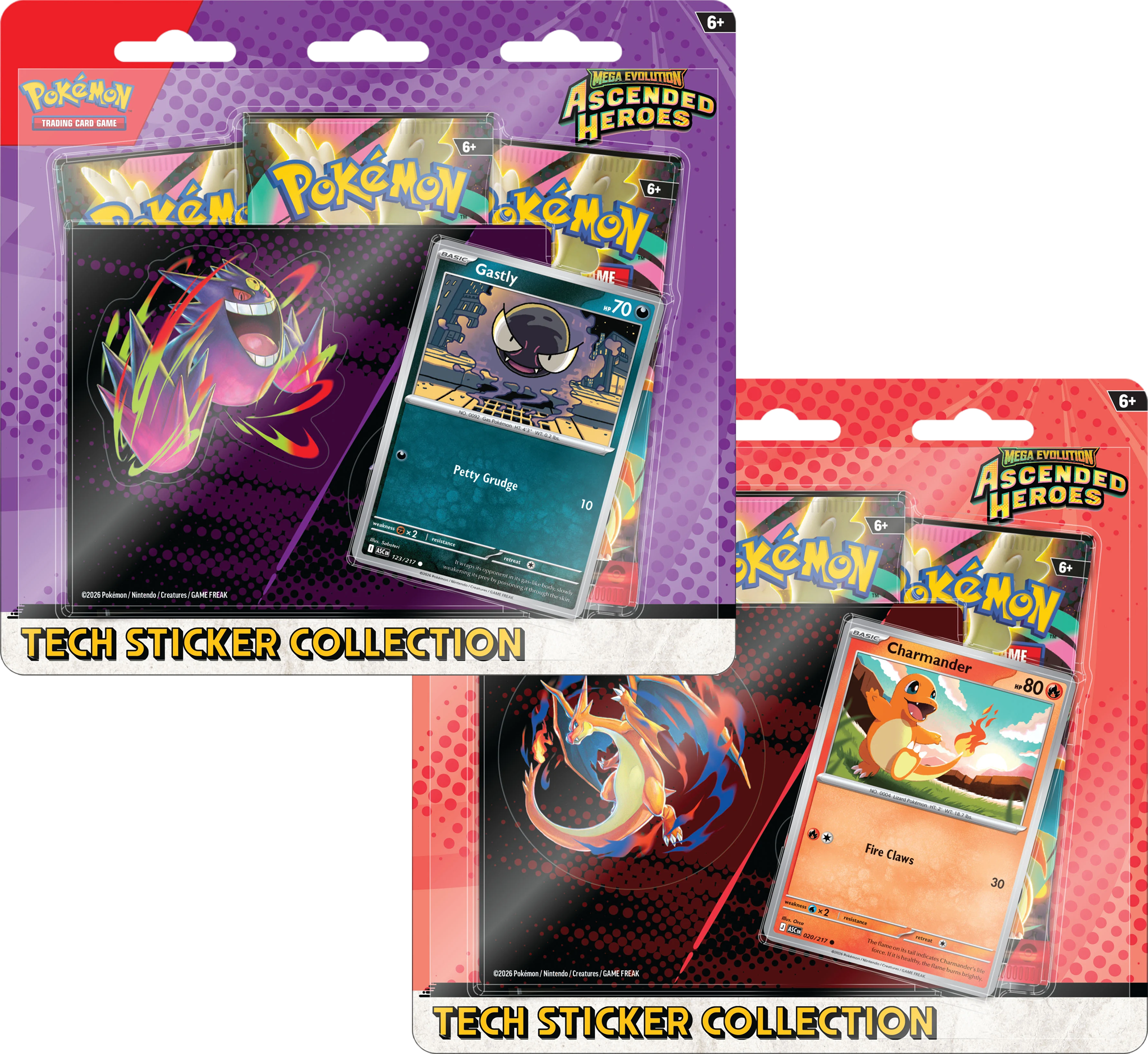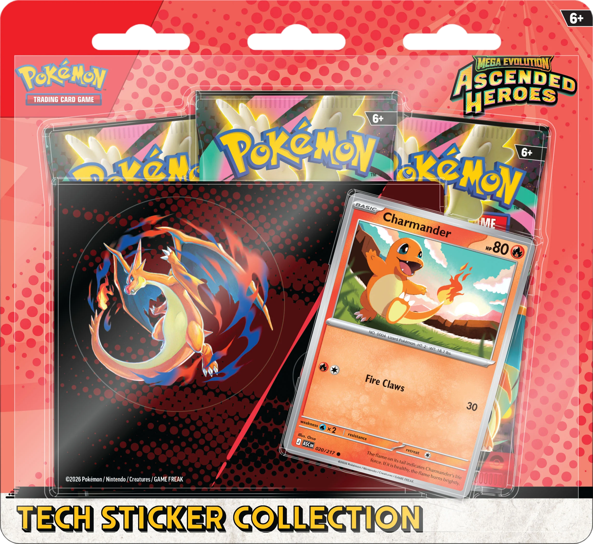 Mega Evolve Your Sticker Game! Pokémon from the Kanto region are ascending to greatness—as both promo cards and tech stickers! In this collection, you’ll find either Charmander or Gastly as a foil promo card, plus a sheet of tech stickers featuring Charmander and Mega Charizard Y or Gastly and Mega Gengar. Top it all off with even more Pokémon inside three booster packs from the special Mega Evolution—Ascended Heroes expansion!