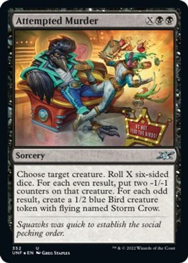 Description: Choose target creature. Roll X six-sided dice. For each even result, put two -1/-1 counters on that creature. For each odd result, create a 1/2 blue Bird creature token with flying named Storm Crow.