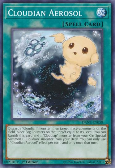 Description: Discard 1 "Cloudian" monster, then target 1 face-up monster on the field; place Fog Counters on that target equal to its Level. You can banish this card and 1 "Cloudian" monster from your GY; Special Summon 1 "Cloudian" monster from your Deck. You can only use 1 "Cloudian Aerosol" effect per turn, and only once that turn.