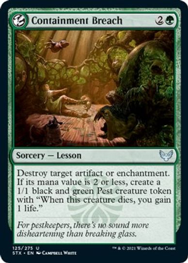 Description: Destroy target artifact or enchantment. If its mana value is 2 or less, create a 1/1 black and green Pest creature token with "When this creature dies, you gain 1 life."