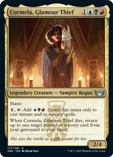 When Cormela, Glamour Thief dies, return up to one target instant or sorcery card from your graveyard to your hand.