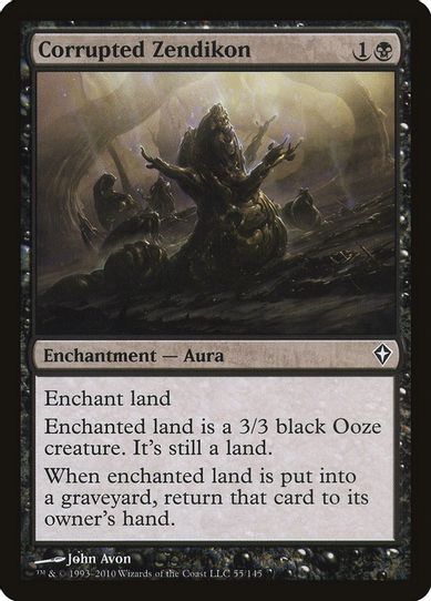 Description: Enchant land Enchanted land is a 3/3 black Ooze creature. It's still a land. When enchanted land is put into a graveyard, return that card to its owner's hand.