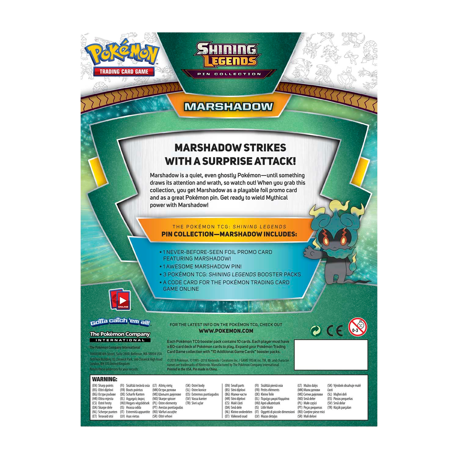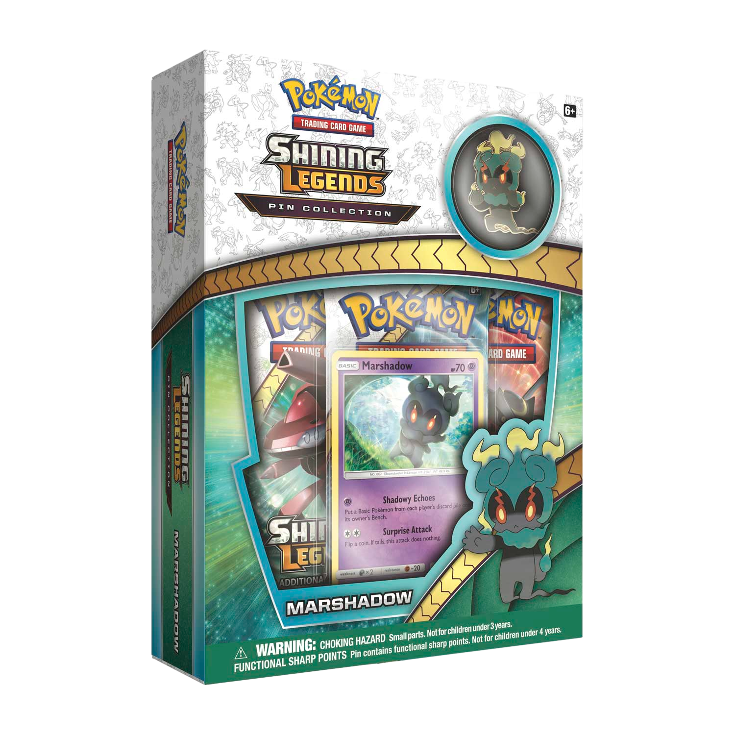 The Pokémon TCG: Shining Legends Pin Collection—Marshadow includes: