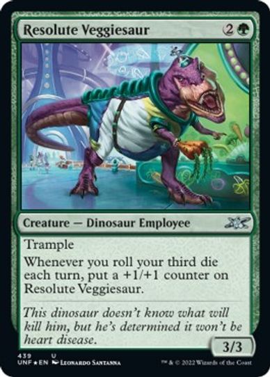 Whenever you roll your third die each turn, put a +1/+1 counter on Resolute Veggiesaur.