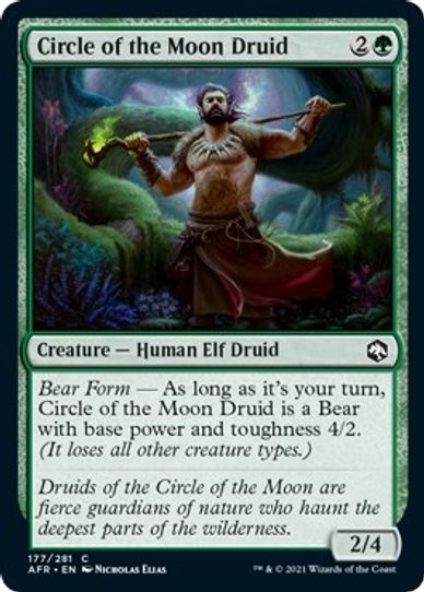 Description: Bear Form — As long as it's your turn, Circle of the Moon Druid is a Bear with base power and toughness 4/2. (It loses all other creature types.)