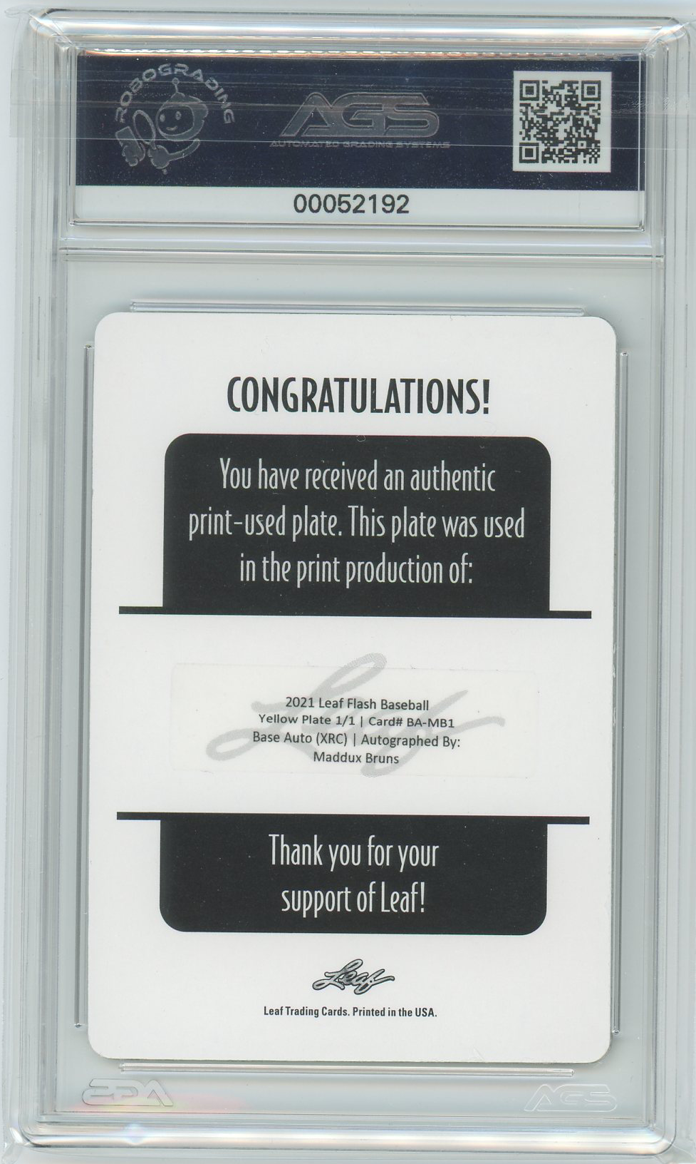 AGS (EX-MT+ 6.5) Maddux Bruns YELLOW PRINTING PLATE Serialized Autograph #1/1 - #BA-MB1 - 2021 Leaf Flash (#00052192)