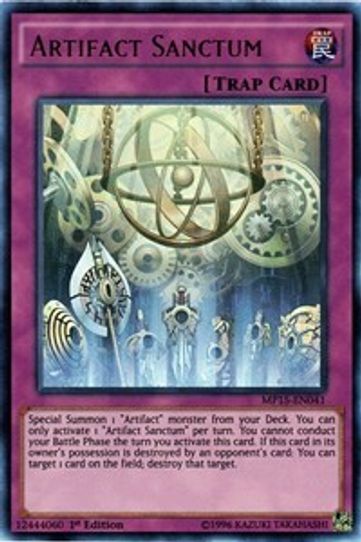 Description: Special Summon 1 "Artifact" monster from your Deck. You can only activate 1 "Artifact Sanctum" per turn. You cannot conduct your Battle Phase the turn you activate this card. If this card in its owner's possession is destroyed by an opponent's card: You can target 1 card on the field; destroy that target.