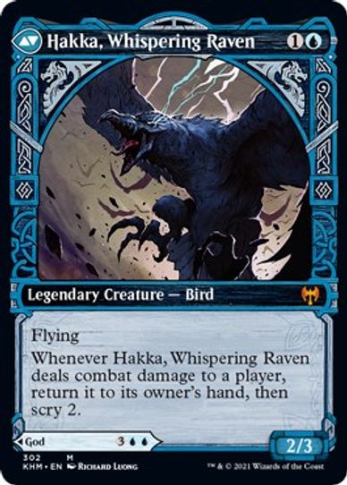 Whenever Hakka, Whispering Raven deals combat damage to a player, return it to its owner's hand, then scry 2.