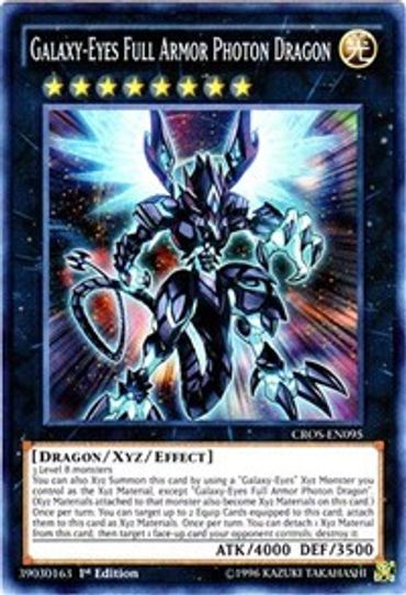 You can also Xyz Summon this card by using a "Galaxy-Eyes" Xyz Monster you control as the Xyz Material, except "Galaxy-Eyes Full Armor Photon Dragon". (Xyz Materials attached to that monster also become Xyz Materials on this card.) Once per turn: You can target up to 2 Equip Cards equipped to this card; attach them to this card as Xyz Materials. Once per turn: You can detach 1 Xyz Material from this card, then target 1 face-up card your opponent controls; destroy it.