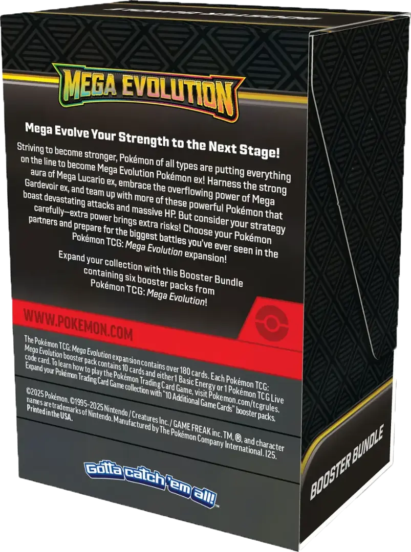 Striving to become stronger, Pokémon of all types are putting everything on the line to become Mega Evolution Pokémon ex! Harness the strong aura of Mega Lucario ex, embrace the overflowing power of Mega Gardevoir ex, and team up with more of these powerful Pokémon that boast devastating attacks and massive HP. But consider your strategy carefully—extra power brings extra risks! Choose your Pokémon partners and prepare for the biggest battles you’ve ever seen in the Pokémon TCG: Mega Evolution expansion!