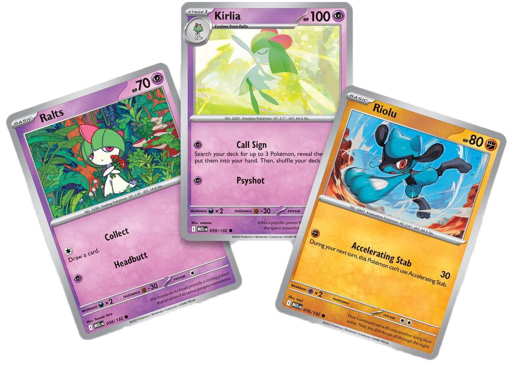 • 3 foil cards featuring Ralts, Kirlia, and Riolu
