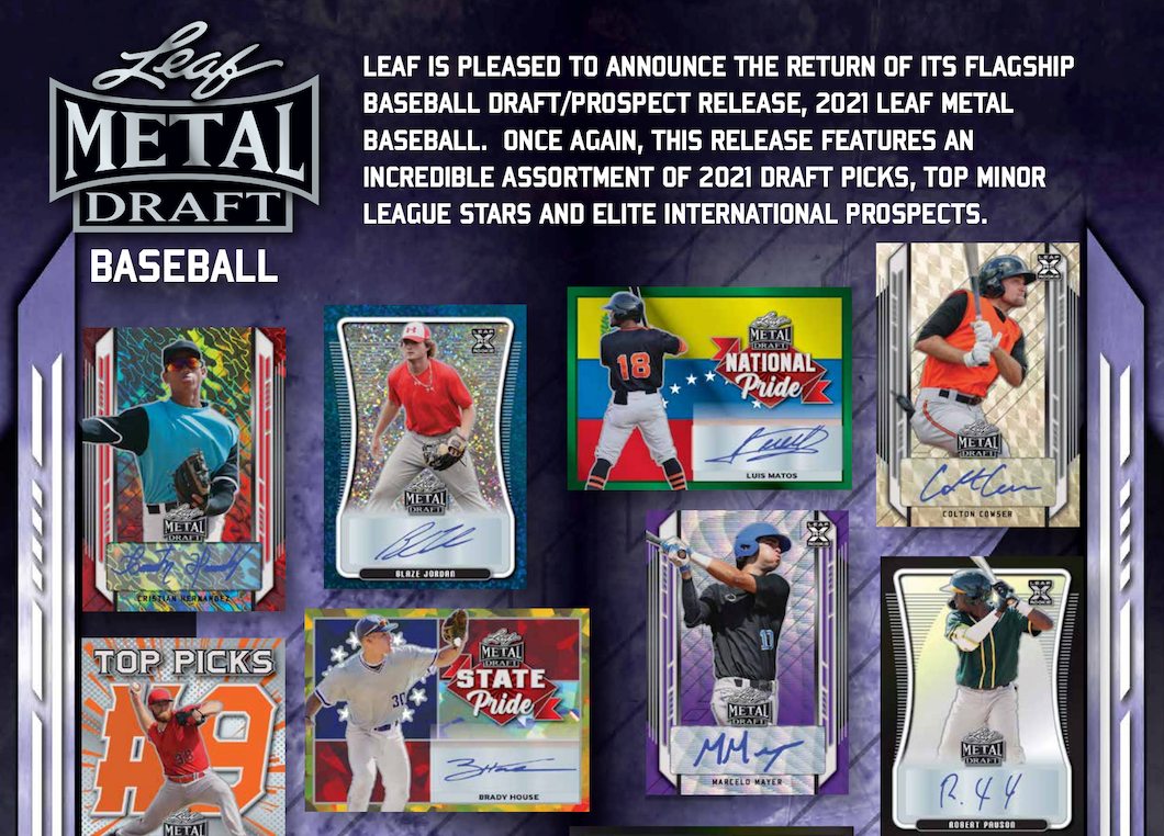 Featuring a variety of talent, 2021 Leaf Metal Draft Baseball is an all-autograph release. The base Metal Autograph line highlights key names with XRC designations and showcases several parallel tiers.