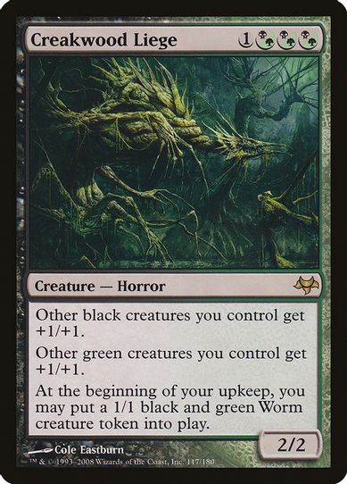 Description: Other black creatures you control get +1/+1. Other green creatures you control get +1/+1. At the beginning of your upkeep, you may put a 1/1 black and green Worm creature token into play.