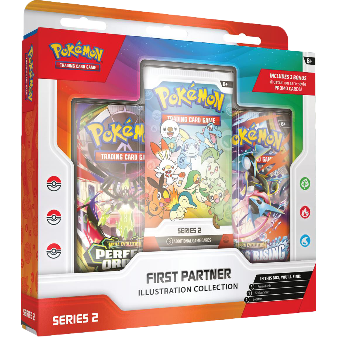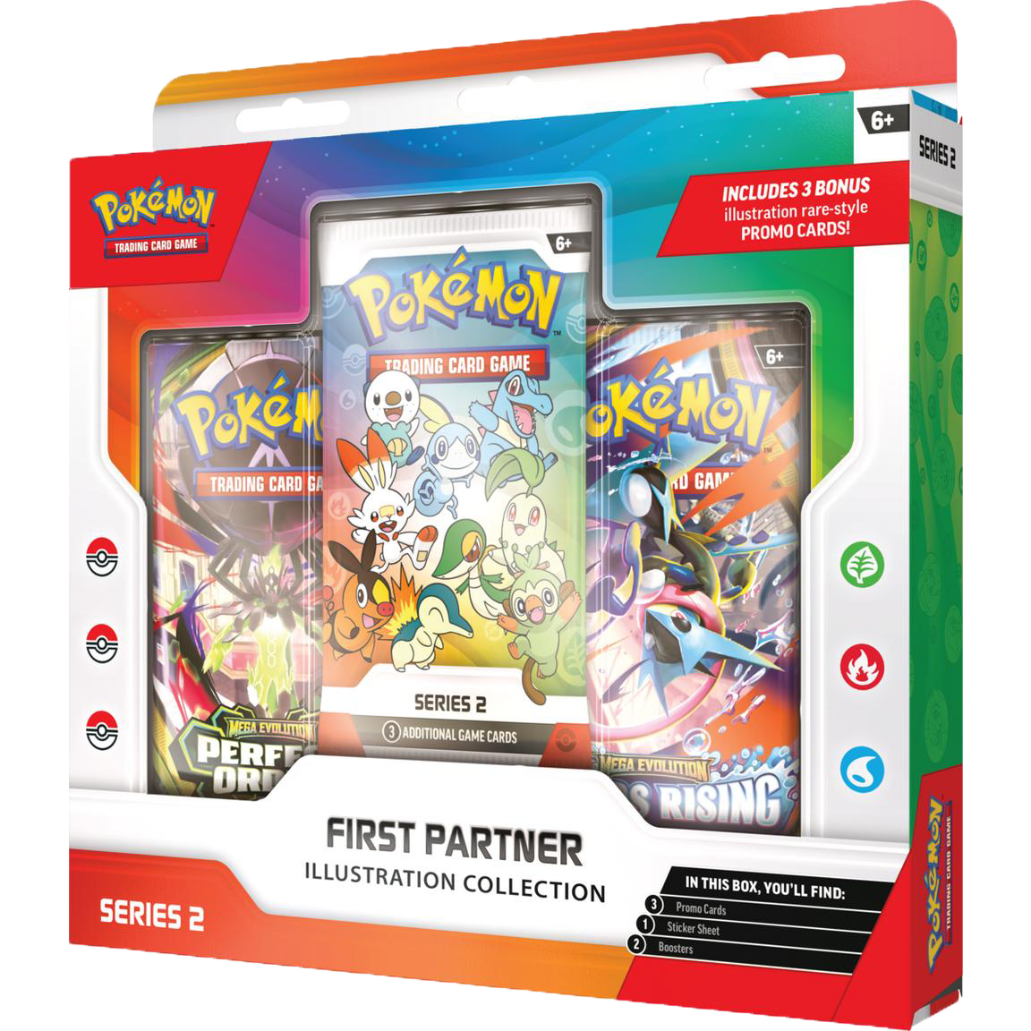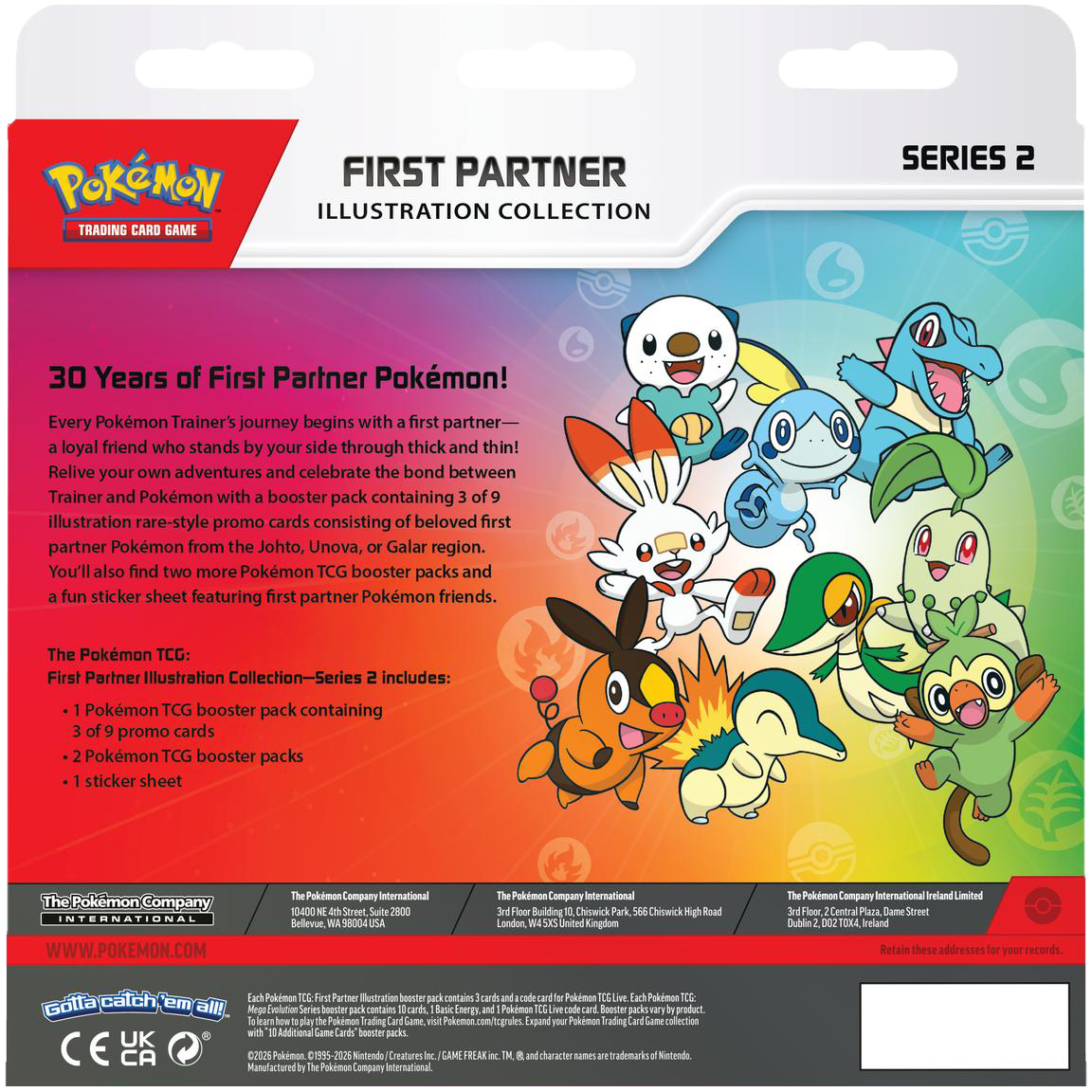 30 Years of First Partner Pokémon! Every Pokémon Trainer’s journey begins with a first partner—a loyal friend who stands by your side through thick and thin! Relive your own adventures and celebrate the bond between Trainer and Pokémon with a booster pack containing 3 of 9 illustration rare-style promo cards consisting of beloved first partner Pokémon from the Johto, Unova, or Galar region. You’ll also find two more Pokémon TCG booster packs and a fun sticker sheet featuring first partner Pokémon friends.