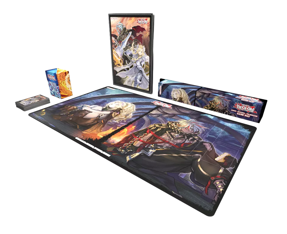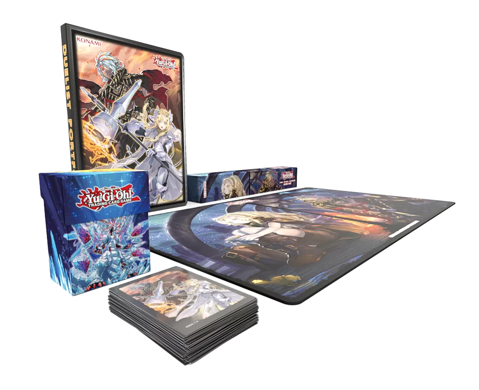 The Albaz – Ecclesia – Tri-Brigade Card items feature the artwork of Fallen of Albaz and Dogmatika Ecclesia, the Virtuous, both of which made their debut in the core booster set, Rise of the Duelist.