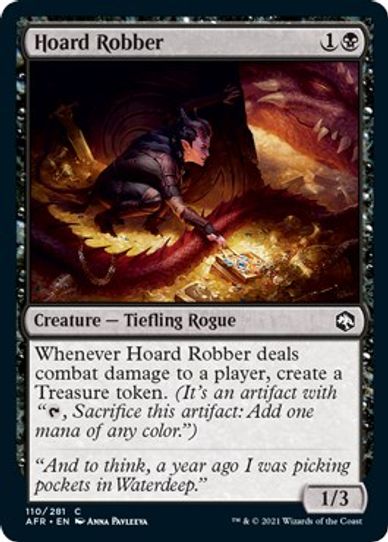 Description: Whenever Hoard Robber deals combat damage to a player, create a Treasure token. (It's an artifact with "T, Sacrifice this artifact: Add one mana of any color.")