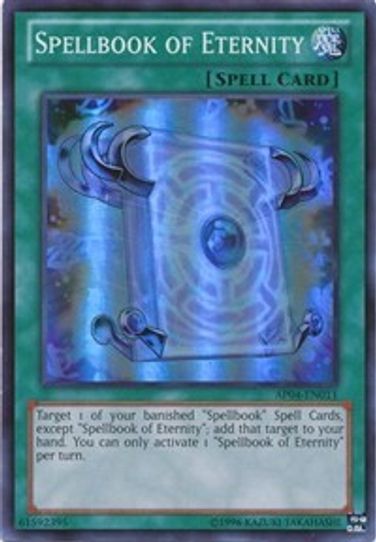 Description: Target 1 of your banished "Spellbook" Spell Cards except "Spellbook of Eternity"; add that target to your hand. You can only activate 1 "Spellbook of Eternity" per turn.