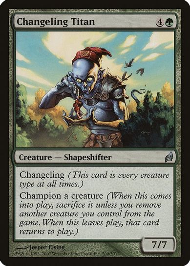 Description: Changeling (This card is every creature type at all times.) Champion a creature (When this comes into play, sacrifice it unless you remove another creature you control from the game. When this leaves play, that card returns to play.)