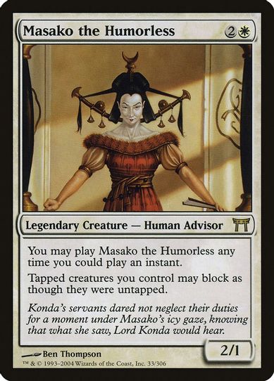 Description: You may play Masako the Humorless any time you could play an instant. Tapped creatures you control may block as though they were untapped.
