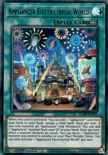 Description: When this card is activated: You can add 1 "Appliancer" card from your Deck to your hand, except a Field Spell. Once per turn, if you Link Summon an "Appliancer" Link Monster(s): You can add 1 "Appliancer" monster from your GY to your hand. Once per turn, when a monster declares an attack: You can move 1 "Appliancer" monster you control to another of your Main Monster Zones. You can only activate 1 "Appliancer Electrilyrical World" per turn.