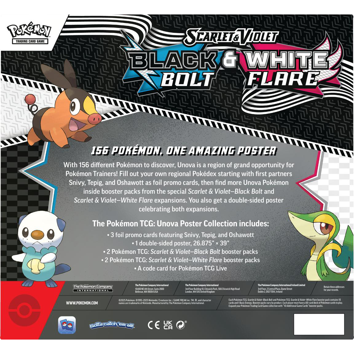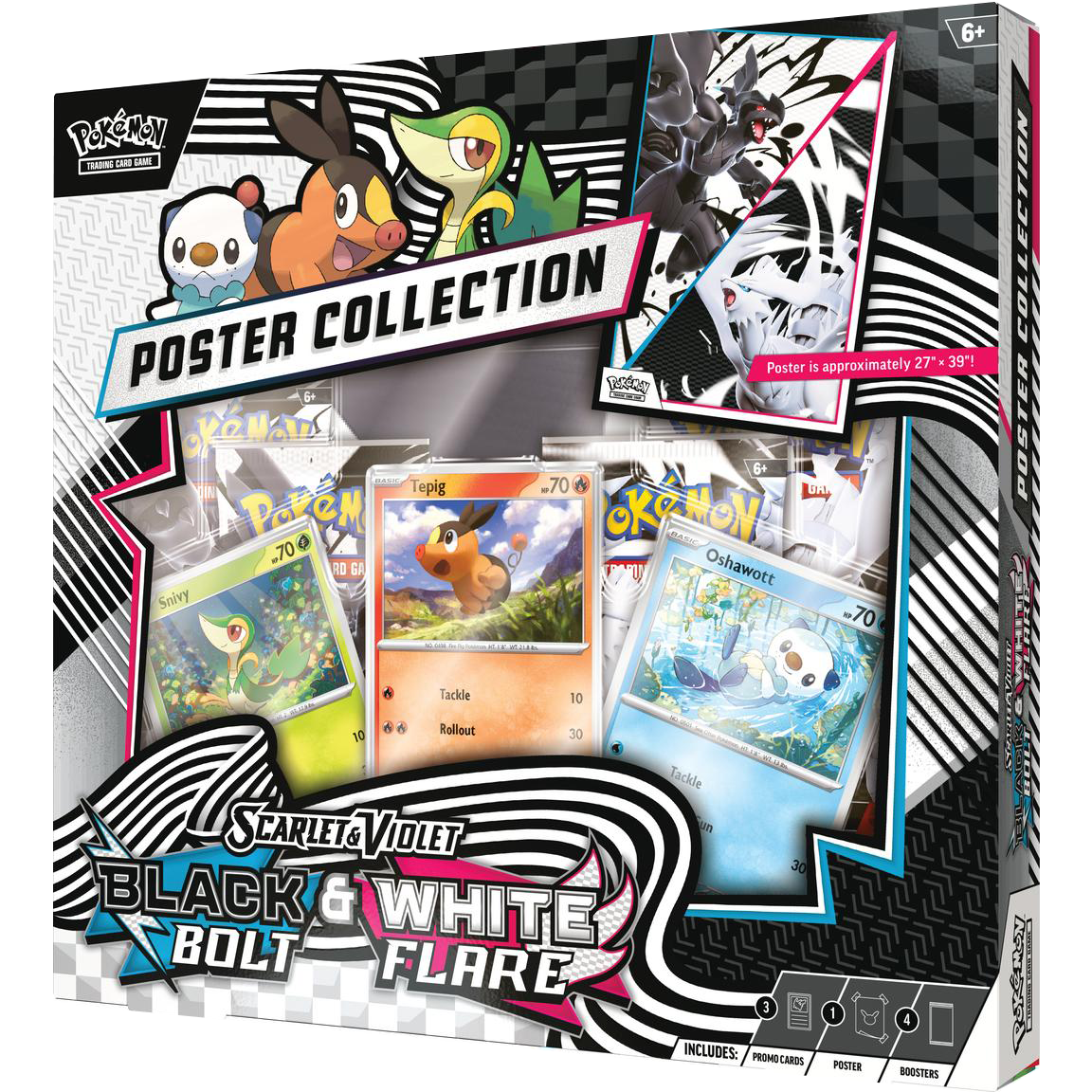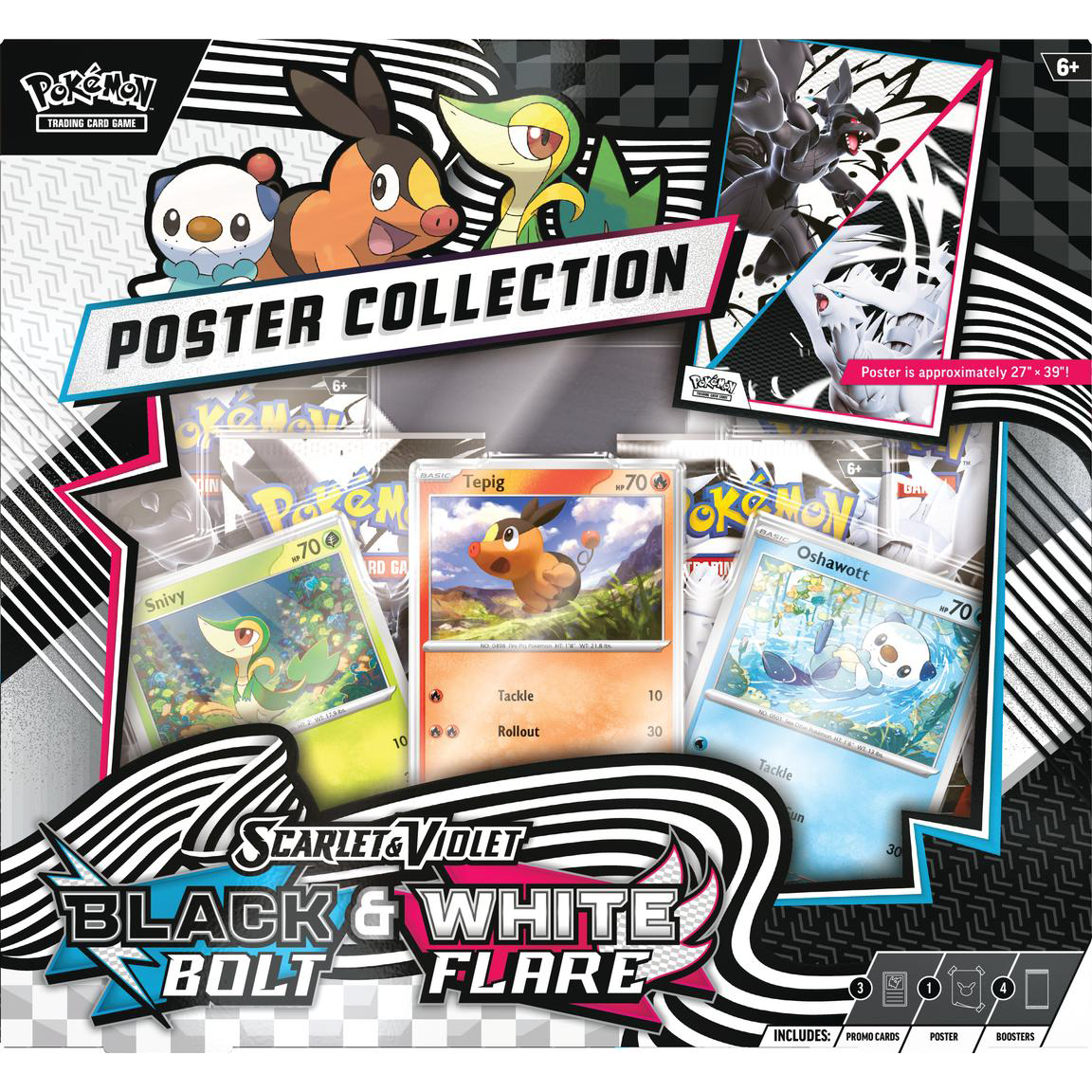 Pokemon Favorites in the palm of your hand! The Pokemon TCG: Unova Poster Collection includes two Black Bolt booster packs, two White Flare booster packs, three promo cards featuring Snivy, Tepig and Oshawott; and one full-size, two-sided poster.