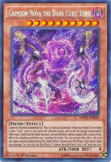 Description: Cannot be Normal Summoned/Set. Must be Special Summoned (from your hand) by revealing 3 other "Cubic" cards in your hand with different names, and cannot be Special Summoned by other ways. Unaffected by other monsters' activated effects, whose original ATK is 3000 or less. When this attacking card destroys a monster by battle: You can activate this effect; this card can make a second attack during this Battle Phase. During your End Phase: Each player takes 3000 damage. You can only use this effect of "Crimson Nova the Dark Cubic Lord" once per turn.