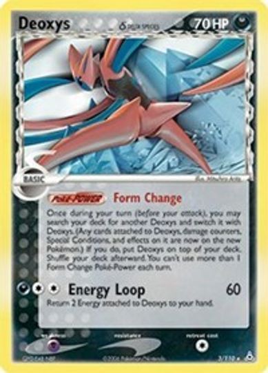 Once during your turn (before your attack), you may search your deck for another Deoxys and switch it with Deoxys. (Any cards attached to Deoxys, damage counters, Special Conditions, and effects on it are now on the new Pokemon.) If you do, put Deoxys on top of your deck. Shuffle your deck afterward. You can't use more than 1 Form Change Poke-Power each turn.