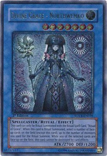 Description: This card can only be Ritual Summoned with the Ritual Spell Card, "Ritual of Grace". When this card is Ritual Summoned, select a number of face-up cards on the field (except this card), up to the number of monsters you used for the Ritual Summon. While any of the selected cards are face-up on the field, this card cannot be destroyed by card effects.