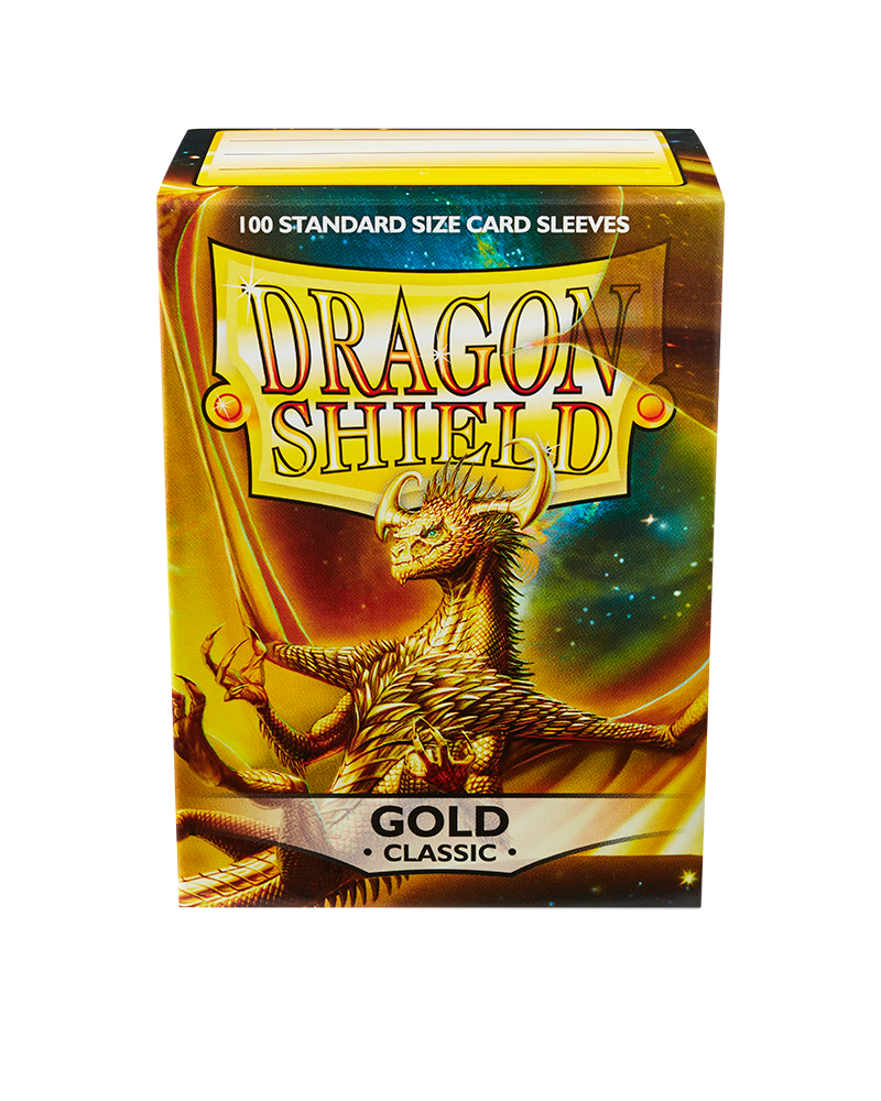 Clear front & metallic Gold back. Warm and metallic, for the gilded royalty. Classic is the original Dragon Shield sleeve. Smooth with a glossy back and unparalleled seal strength. The sturdy cardboard box fits 75+ single sleeved cards or 65+ double sleeved cards. Every box has a label at the top of the box for personalization.