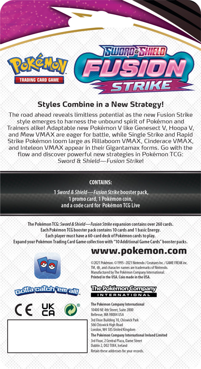 The path ahead is riddled with rivals and fierce battles. Fortunately, it also harbors limitless potential as the new Fusion Strike style emerges, capturing the unbound spirit of Pokémon and Trainers alike! Adaptable new Pokémon V like Genesect V, Hoopa V, and Mew VMAX are eager for battle, while Single Strike and Rapid Strike Pokémon loom large as Rillaboom VMAX, Cinderace VMAX, and Inteleon VMAX appear in their Gigantamax forms. Go with the flow and discover powerful new strategies in Pokémon TCG: Sword & Shield—Fusion Strike!