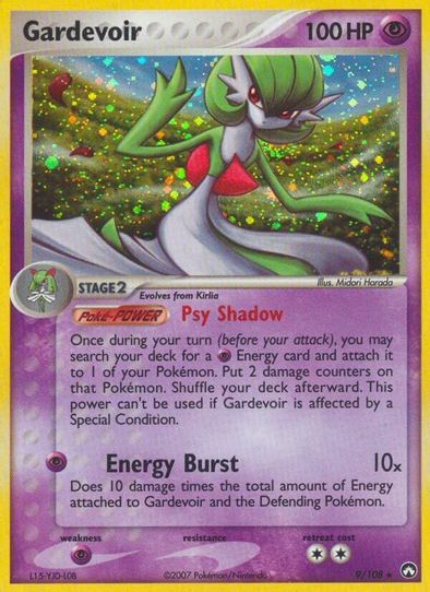 Attack 1: [P] Energy Burst (10x) Does 10 damage times the total amount of Energy attached to Gardevoir and the Defending Pokemon.