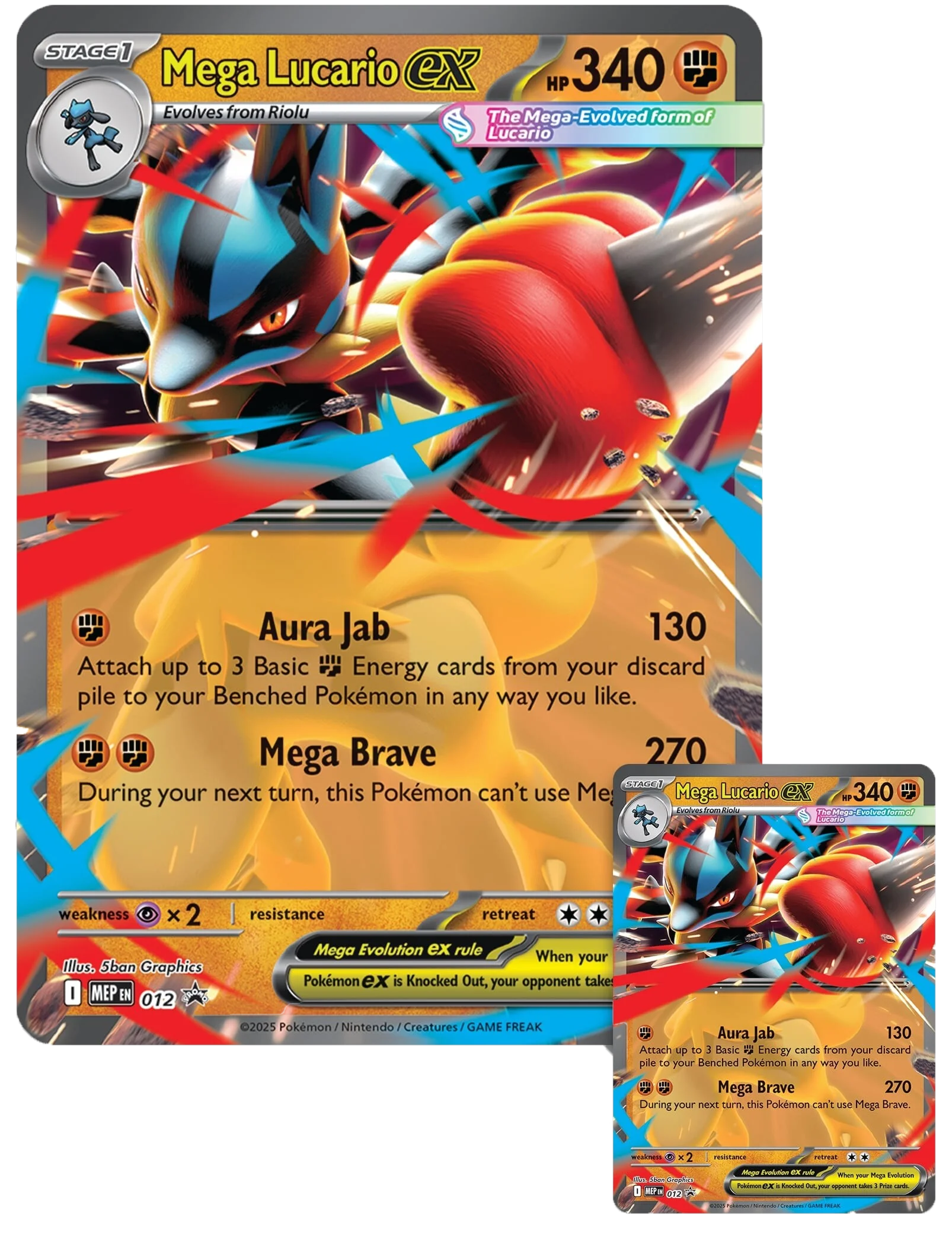 Showing no mercy, Mega Lucario ex pummels opponents while sharing discarded Energy with your Benched Pokémon! Bring this massive power to your own collection as a playable foil promo card paired with an oversize promo card and a detailed figure showing off Mega Lucario in action. You'll find even more awesome Pokémon inside the stack of included booster packs.