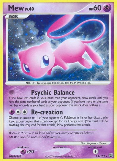 Attack 2: [2P] Re-creation - Choose an attack of 1 of your opponent's Pokemon in his or her discard pile. Re-creation copies that attack except for its Energy cost. (You must still do anything else required for that attack.) Mew performs that attack.