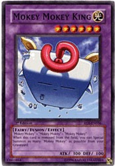 Description: "Mokey Mokey" + "Mokey Mokey" + "Mokey Mokey" When this card is removed from the field, you can Special Summon as many "Mokey Mokey" as possible from your Graveyard.