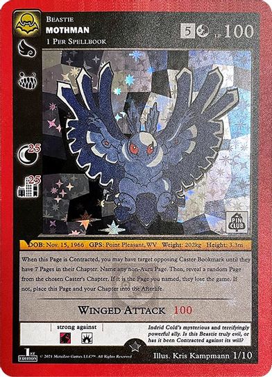Ability: When Mothman is Contracted, you may have target Caster Bookmark Pages from the top of their Spellbook until they have exactly 7 Pages in their Chapter and you prophesize (name) any non-Aura Page (if the chosen Caster has 7 or more Pages in their Chapter already, they do not discard or Bookmark any Pages). Then, reveal a Page at random from the chosen Caster's Chapter and if it is the Page you named, they lose the game. If it is not the Page you named, place Mothman and your entire Chapter in the Afterlife.