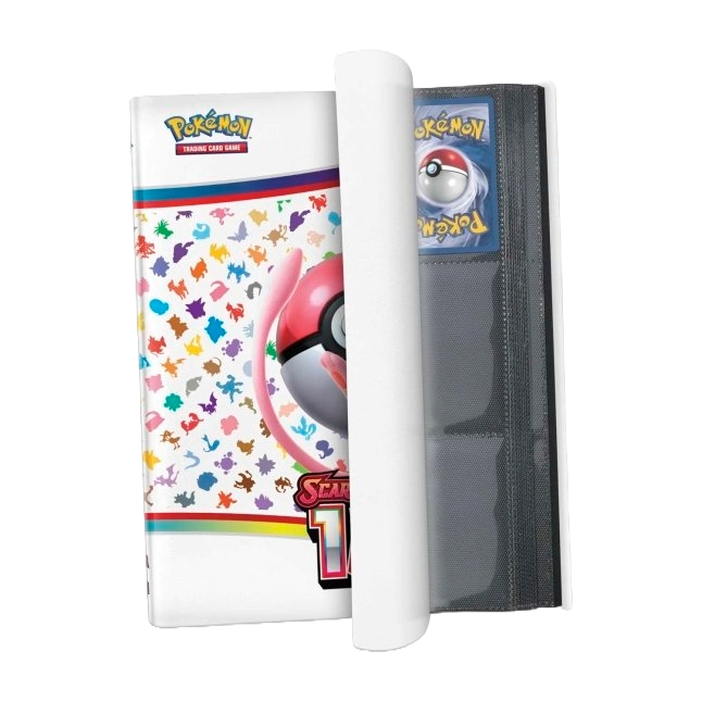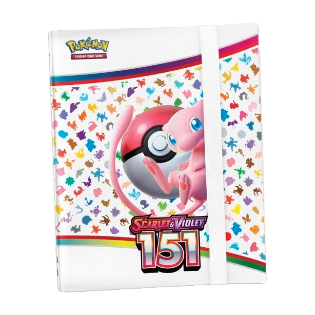 The Scarlet & Violet "151" 9-Pocket Binder for Pokémon features a vibrant, full-art cover showcasing Mew, along with all 151 original Pokémon's silhouettes. and an elastic strap closure. 20 pages of side-loading pockets and low-friction material help keep cards in place. Safely stores up to 360 cards or more in archival-safe, acid-free, non-PVC pages.
