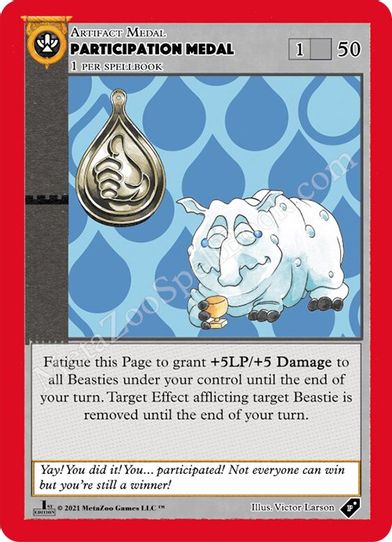 Description: Fatigue this Page to grant +5LP/+5 Damage to all Beasties under your control until the end of your turn. Target Effect affliction target Beastie is removed until the end of your turn.