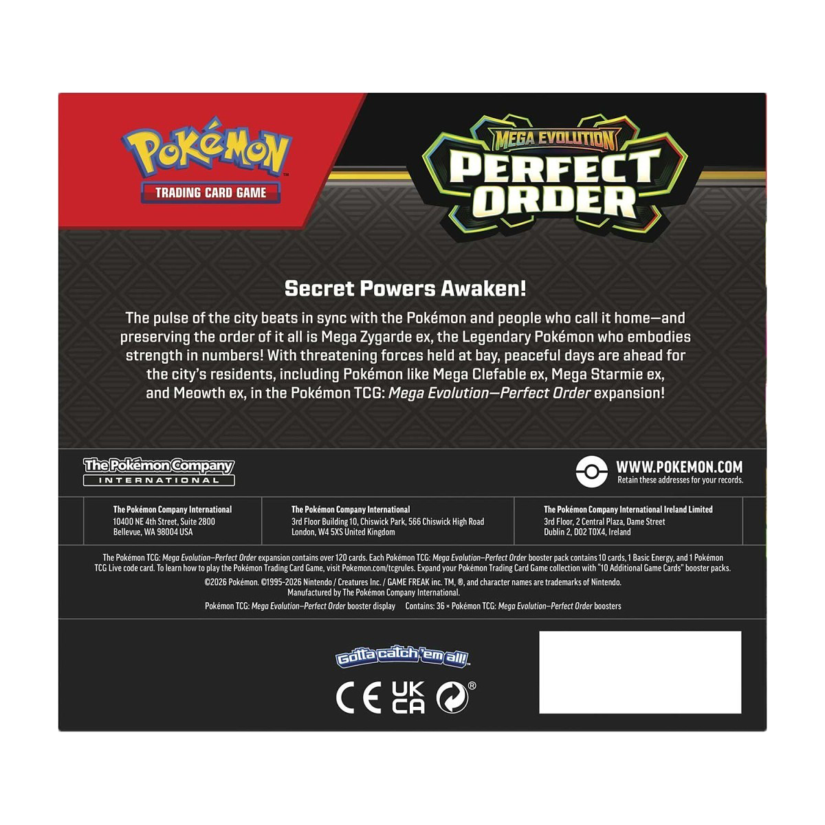- Includes 36 booster packs from the Pokémon TCG: Mega Evolution—Perfect Order expansion