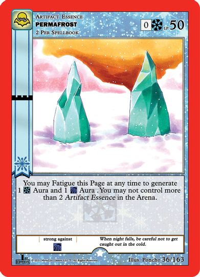 Description: You may Fatigue this Page at any time to generate 1 Frost Aura and 1 Water Aura. You may not control more than 2 Artifact Essence in the Arena.