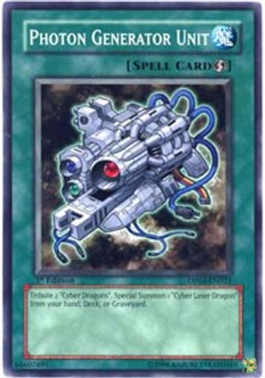 Description: Tribute 2 "Cyber Dragon"s. Special Summon 1 "Cyber Laser Dragon" from your hand, Deck, or Graveyard.