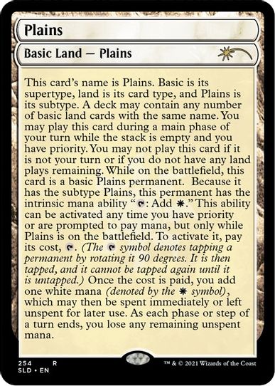 Description: This card's name is Plains. Basic is its supertype, land is its card type, and Plains is its subtype. A deck may contain any number of basic land cards with the same name. You may play this card during a main phase of your turn while the stack is empty and you have priority. You may not play this card if it is not your turn or if you do not have any land plays remaining. while on the battlefield, this card is a basic Plains permanent. Because it has the subtype Plains, this permanent has the intrinsic mana ability "T: Add W." This ability can be activated any time you have priority or are prompted to pay mana, but only white Plains is on the battlefield. To activate it, pay its cost, T. (The T symbol denotes tapping a permanent by rotating it 90 degrees. it is then tapped, and it cannot be tapped again until it is untapped.) Once the cost is paid, you add one white mana , which may then be spend immediately or left unspent for later use. As each phrase or step of a turn ends, you lose any remaining unspent mana.