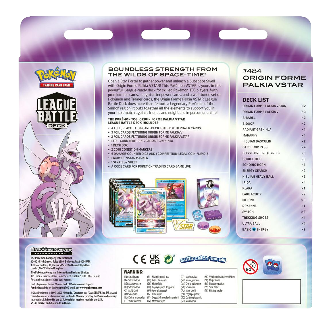 Boundless Strength from the Wilds of Space-Time!Open a Star Portal to gather power and unleash a Subspace Swell with Origin Forme Palkia VSTAR!This Pokémon VSTAR is yours in this powerful, League-ready deck for skilled Pokémon TCG players.With premium foil cards, sought-after power cards, and a well-tuned set of Pokémon and Trainer cards,the Origin Forme Palkia VSTAR League Battle Deck does more than feature a Legendary Pokémon ofthe Sinnoh region: it puts together all the elements to support you in your next match against friendsand neighbors, in person or online!