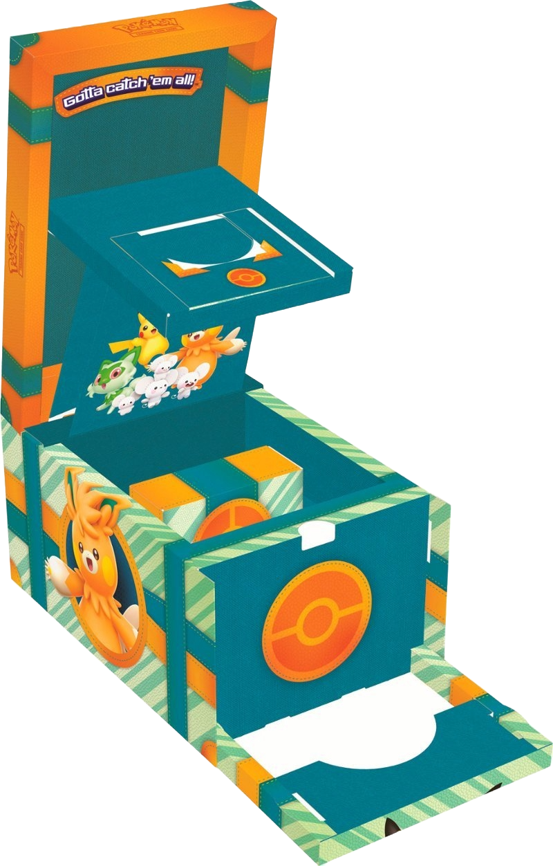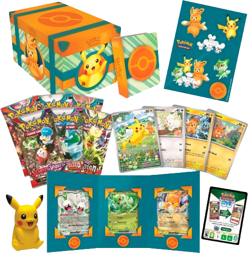 A world of adventure awaits Pokémon Trainers in the Paldea region! Gear up for battle with a big handful of ready-to-play promo cards featuring cute yet feisty Pokémon, then open up a set of booster packs to find even more friends! Along the way, you’ll get to decorate your gear with tech stickers, show off your collection with a mini portfolio, and give a squishy toy Pikachu a squeeze.