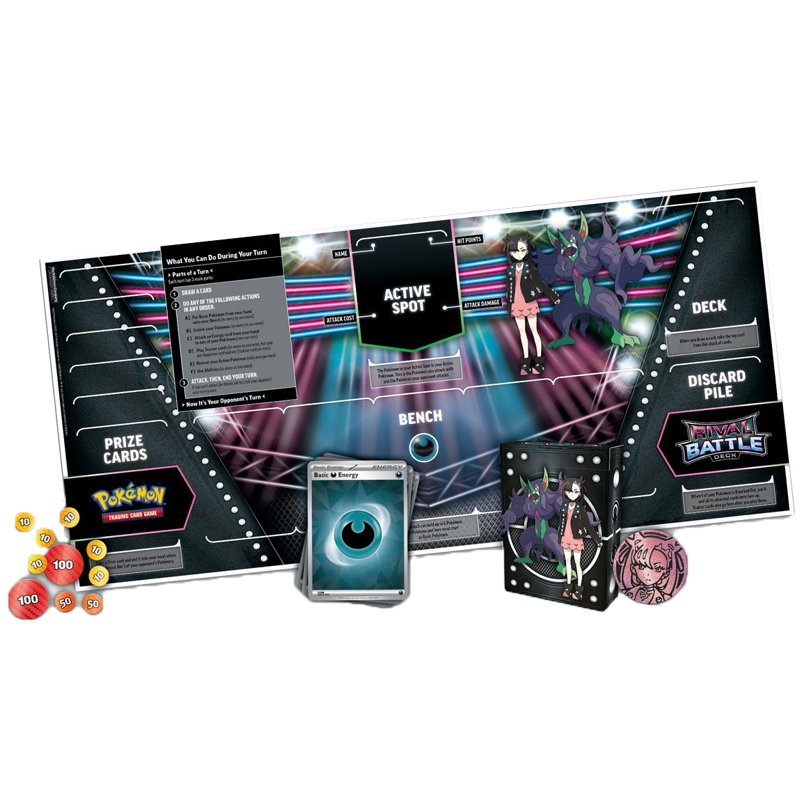 Inside the Rival Battle Deck of your choice, you’ll find a paper playmat themed around Marnie or Steven, complete with beginner friendly instructions, a set of damage counters, a large metallic coin featuring Marnie or Steven, a code card to play the deck online, and a special promo card featuring Steven or Marnie with their partner Pokémon.